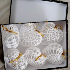 Háčkované srdce – vianočná ozdoba na zavesenie, výška 6 cm, plastikové srdce obháčkované bielou niťou. Predáva sa ako sada 6 ks v darčekovom balení, v ktorom si ho môžete uschovať na ďalšie použitie. Vyrobené z láskou pre Vás 😊