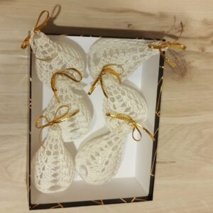 Háčkovaná kvapka – vianočná ozdoba na zavesenie, výška 13 cm, plastiková kvapka obháčkovaná bielou niťou. Predáva sa ako sada 6 ks v darčekovom balení, v ktorom si ich môžete uschovať na ďalšie použitie. Vyrobené z láskou pre Vás 😊
