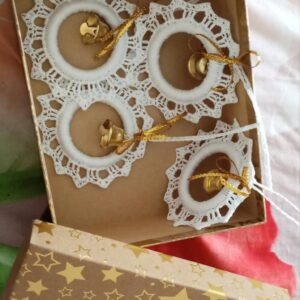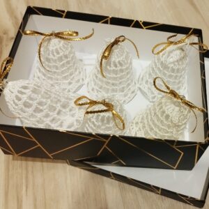 Háčkovaný zvonček – vianočná ozdoba na zavesenie, výška 8 cm, plastikový zvonček obháčkovaný bielou niťou. Predáva sa ako sada 6 ks v darčekovom balení, v ktorom si ho môžete uschovať na ďalšie použitie. Zvonček zvoní. Vyrobené z láskou pre Vás 😊