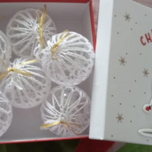 Ponúkame na predaj vianočné gule, sú to obháčkované plastové gule, veľkosť 8cm, predávajú sa po 6 ks v balení. Zabalené sú v darčekovej bielej krabici s okienkom, v ktorej si ich môžete bezpečne uschovať, aby ste ich mali na Vianoce vždy poruke. Naši zamestnanci ich vyrobili z láskou pre Váš. Farba biela, modrá, červená, podľa objednávky sa dá upraviť.
