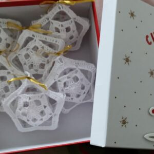Háčkovaná hviezda – vianočná ozdoba na zavesenie, výška 12 cm, plastiková hviezda obháčkovaná bielou niťou. Predáva sa ako sada 6 ks v darčekovom balení, v ktorom si ich môžete uschovať na ďalšie použitie. Vyrobené z láskou pre Vás 😊
