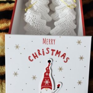 Háčkovaný stromček – vianočná ozdoba na zavesenie, výška 11 cm, plastikový stromček obháčkovaný bielou niťou. Predáva sa ako sada 6 ks v darčekovom balení, v ktorom si ho môžete uschovať na ďalšie použitie. Vyrobené z láskou pre Vás 😊